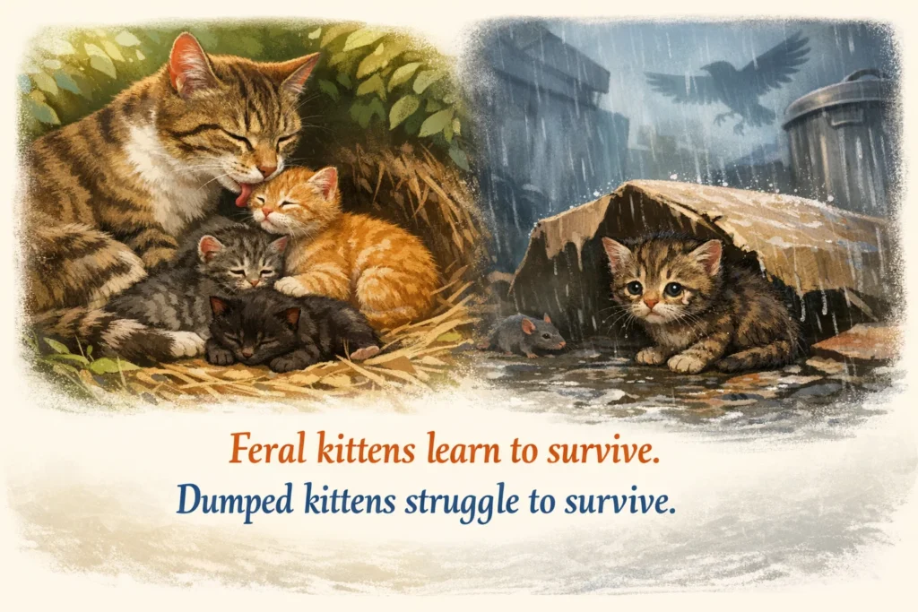 Feral kittens do not survive because they are alone. They survive because they are raised by their mother. Dumped kittens, by contrast, are deprived of the very thing that makes survival possible.